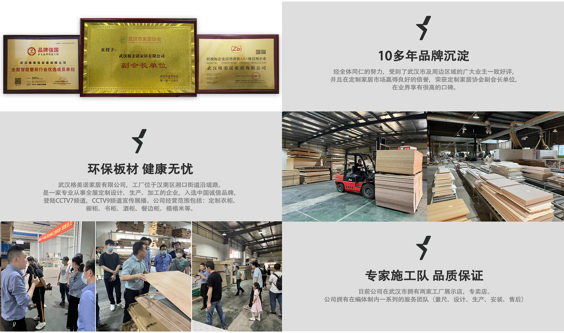 武汉格美诺家居有限公司创立于 2016 年,是武汉本土专注全屋定制设计、生产、加工的实体源头企业。公司先后荣获中国诚信品牌称号,品牌宣传片登陆CCTV7、CCTV9展播,是武汉市定制家居协会副会长单位,凭借稳定品质与专业服务,在武汉及周边区域积累了良好口碑与广泛好评。 公司主营定制衣柜、橱柜、书柜、酒柜、餐